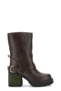 Black leather ankle boots with ankle strap and buckle, 9 cm high heel, suede-effect covering, and lug sole. Zip interior and leather insole. Bold and stylish for winter.