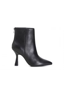 Leather ankle boots with asymmetrical high heel and tapered toe. Sexy and sophisticated, to embellish bold looks.