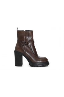 High-heeled leather ankle boots with moccasin-style stitched toe box and studded loop. Rubber platform decorated with a pattern evoking the world of sport. Internal zip and decorated lace that serves as an ankle strap.