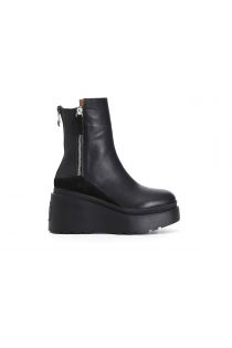 Leather ankle boots with suede insert and multiple decorative metal zips, which also add grit. Wedge sole customised with embossed logo on the back.