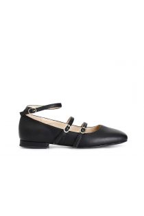 Leather ballet flat with laces and ankle strap. 15 mm high covered heel. the lining and insole are in leather.