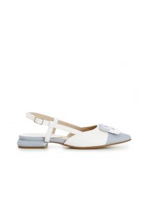 Open back leather ballet flats with square accessory decorating the tip. leather-clad heel.