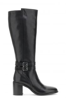 Leather knee-high boots with buckles and a side zip. Leather insole for maximum comfort. 73 cm heel. Elegance and character for your winter look.