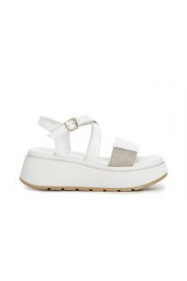 Two-tone criss-cross leather sandals with glitter on wedge.