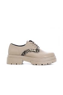Leather Derby shoes with spotted pony hair appliqué. Undulating outsole and thin lacing.