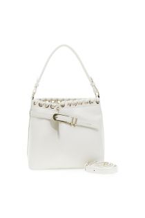Women's faux leather bucket bag with an elegant design featuring a front pleat secured by a drawstring with a buckle and metal loops. it features a woven sail motif on the edge and a chic removable shoulder strap. dimensions: 26 cm (length) × 25 cm (height) × 16 cm (depth).