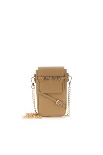 Leather-look cell phone case with a flap decorated with lettering stripes and a buckle. Detachable chain shoulder strap.