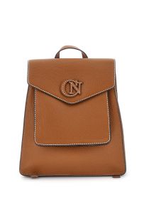 Women's backpack in grained leather-look material with a logo flap and hand-stitched seams. a practical front pocket and contrasting stitching add a touch of elegance and urban style. dimensions: 26 cm (length) × 28 cm (height) × 11 cm (depth).