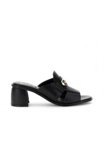 Faux leather sandal with gold hardware minimal design and comfortable fit. a leather insole and 6 cm block heel for an elegant and versatile look. the ideal shoe to complete any everyday outfit.