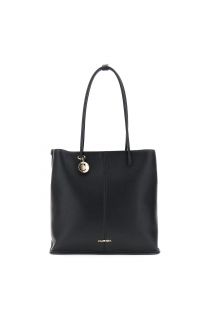 Faux leather tote with sliding tubular handles, removable charm, and metal lettering. Clean and versatile design for an elegant and functional style.