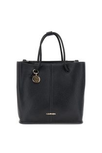 Faux leather bucket bag with sliding tubular handles, metal eyelets, and a removable charm. A modern look and sophisticated details for bold outfits.