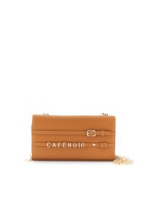 Leather-look wallet with two compartments, one with a flap and one with a zip, decorated with lettering stripes and a buckle. Detachable chain shoulder strap.
