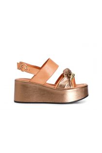 Two-tone leather laminated fisherman sandals on wedge with chain accessory.