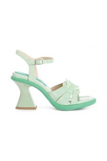 Suede and napa gilda sandals with 15mm platform. adjustable buckle strap at the ankle. woven feature and ring accessory. padded genuine leather insole. 70 mm-high reel heel.