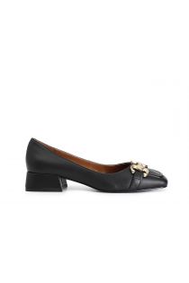 Leather ballerina with square toe and golden horsebit. perfect footwear to complete everyday looks with simplicity yet style. the square heel is 35mm and the insole is leather.