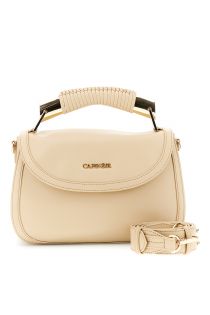 leather-look flap bag with metal handle and decorative threading cream