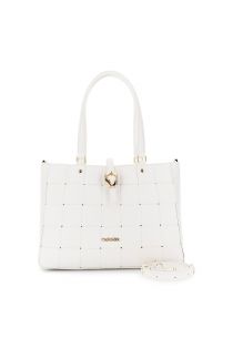 leather-look tote with woven panel and buckle loop white