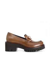 Women's leather loafer with golden horsebit. the heel is 55mm high. comfortable leather insole. lug sole.