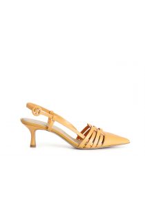 Leather pumps open at the back with straps and tapered toe. heel h. 55mm
