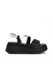 Two-tone leather sandals with asymmetrical strap on wedge.