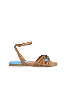 Low leather sandals with ankle strap and two-tone front decoration resembling interwoven leaves.