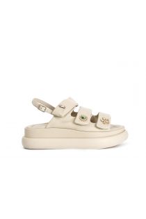 Three-band leather sandals with velcro and jewel buttons. the lining and insole are leather. the wedge h. 4.5 cm. perfect footwear for every situation. ideal for your beach adventures but also for a walk in the city. perfect combination between elegance and practicality.