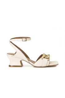Leather sandals with an ankle strap and gold chain accessory. bold reel heel.