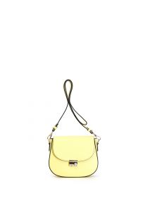 Small flap bag with dual material flap: matching split leather and leather clasp with rhinestones.