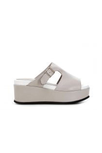 Leather slides with buckle on leather-clad platform and comfortable fussbett.