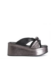 Two-tone leather laminated slides on wedge with chain accessory.