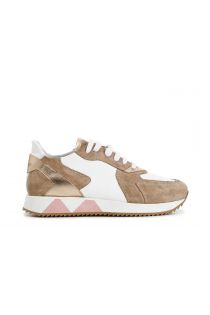 Leather sneakers with a rounded sole characterised by an interplay of multi-material inserts in powdery nuances.
