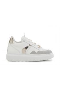 Leather sneakers with box sole and laminated appliqué. Decorative lace hoops with chain