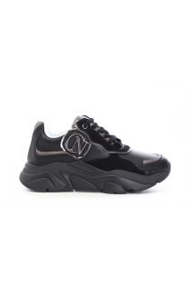 Leather sneakers with laminated inserts, large metal accessory that embellishes the upper. Running sole