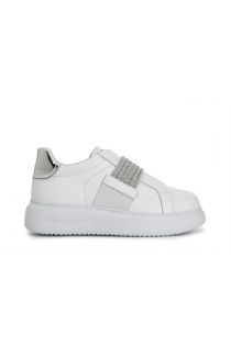 Leather sneakers with glitter and patent leather inserts. elastic rhinestone micro-straps enrich and embellish the shoe and make them easier to put on. the sole is box-shaped and the insole is leather.