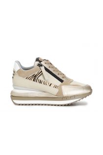 Richly detailed leather sneakers with side zip featuring large animal-print hair and imitation patent leather inserts. Two-tone elevated sole and studs on the heel