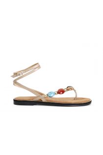 Leather thong sandals with decorated stones and strap. lining and insole are in leather. shoe with a slightly rounded shape. the heel is 2.5 cm.