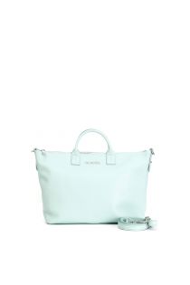 Trapezoid-shaped leather tote bag with handles and optional shoulder strap.
