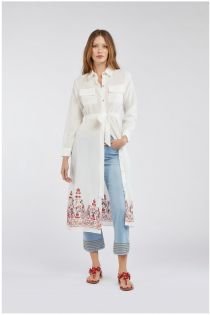 Cotton muslin chemisier dress with embroidered detail at the hem. Front buttoning, belted waist and breast pockets.