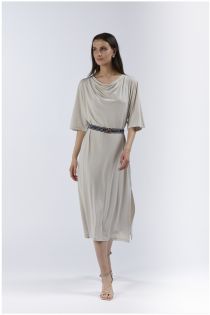 Long dress with side slits and draped neckline made of jersey. elastic belt with logo buckle to mark the waist. short wide sleeve.
