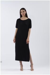 Long dress with side slits and gold logo plaque at the shoulders. dress made of viscose jersey. short balloon sleeves.