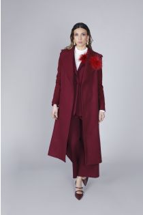 Long robe-style coat with a belted waist and a decorative feather brooch on the lapel. Elegant and modern, perfect for a casual-chic look in the colder months. Regular fit. The model is 173 cm tall and wears a size small.