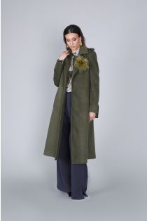 Long dressing gown-style coat with a belted waist and a removable feather brooch. Soft, enveloping, and trendy, ideal for a casual-chic look in the colder months. Regular fit. The model is 173 cm tall and wears a size S.