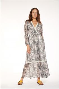 Long dress made of light printed viscose voile. The flounce and the neckline are enriched with macramé passementerie