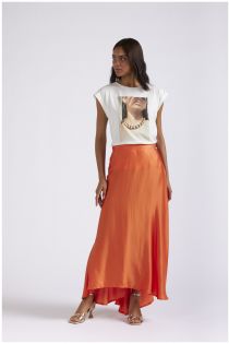 Elegant long skirt with cuts and asymmetries made of a light viscose satin. the model adds a sophisticated touch to special and casual pairings.
