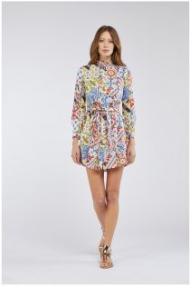 Long shirt with mandarin collar enhanced with seams and slight gathers at the waist that add movement and an easy fit. Available in three exclusive patterned prints.