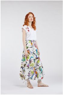 Long gypsy-style skirt with ruffled flounces and elasticated waist. Available in three versions of exclusive prints.