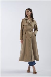 Essential item in the spring wardrobe. long double-breasted trench coat with back and front flap. made of technical fabric. elasticated belt with logo buckle to define the waist. long sleeve.