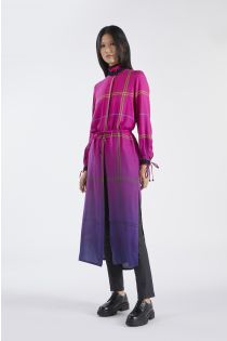 Long chemisier dress in viscose fabric with mandarin collar and belt at the waist.