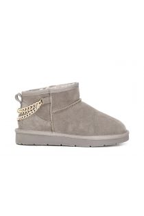 Low-heeled suede ankle boots with decorative chains and faux fur lining