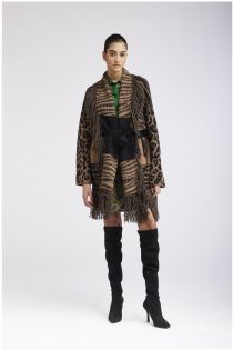 Fringed cardigan made of wool blend yarn with shawl collar. skilful jacquard pattern. available in 3 colour variants.
